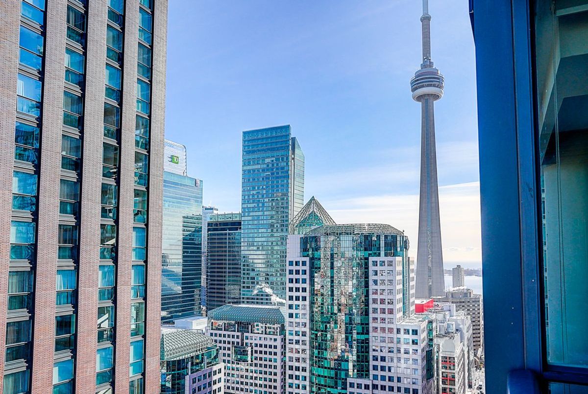 Newly painted with brand-new smooth ceilings, this bright south-east corner 2-bedroom is wrapped in floor-to-ceiling windows, filling the open-concept layout with natural light throughout the day. Enjoy unobstructed CN Tower views, panoramic city vistas, and partial Lake Ontario views from the main living areas. Fresh, clean, and move-in ready, the suite features a functional split-bedroom design and a spacious living/dining area ideal for everyday comfort. Located in the heart of downtown, steps to transit, dining, entertainment, and the Financial District. A beautifully updated corner suite in a prime urban location. Amenities include: 24/7 Concierge, Gym, Yoga room, Meeting Room, Theater Room, Pool, Party room, Sauna and and Plenty of visitor parking. ONE parking space which is located so close to the entrance and TWO lockers.
