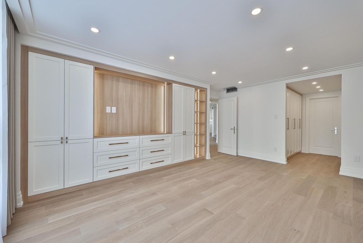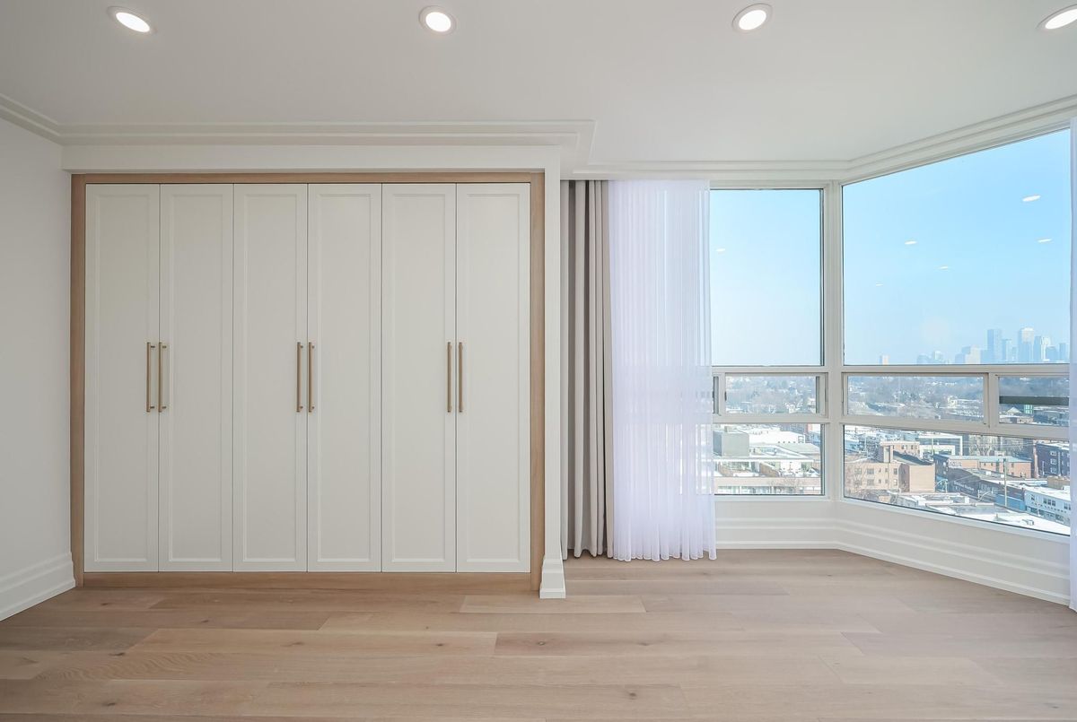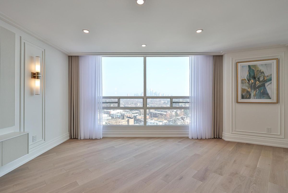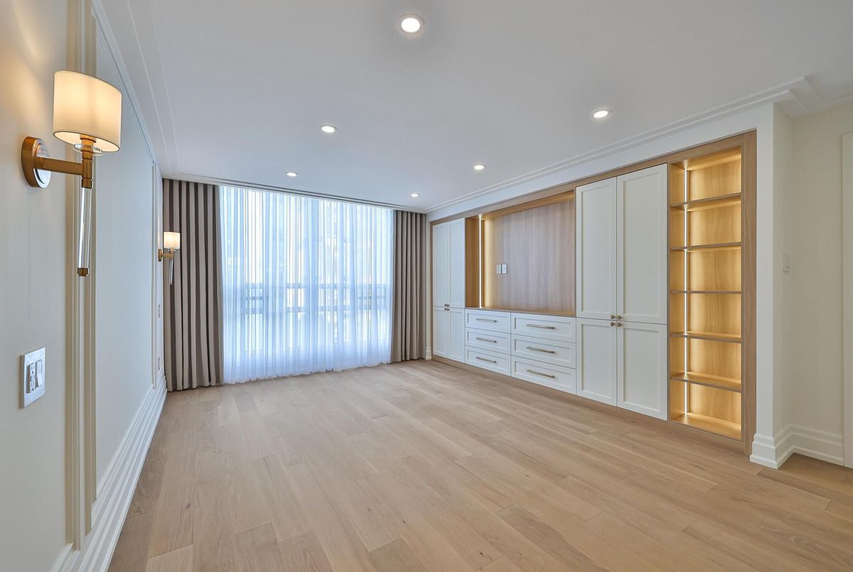 *Perched on a high floor within one of Forest Hill's most distinguished boutique residences, this exceptional suite has been completely redesigned and finished to the highest standards* Showcasing breathtaking, unobstructed southeast views of the city skyline, floor-to-ceiling windows flood the home with natural light and frame magnificent panoramic vistas , creating a bright and elevated atmosphere throughout*Offering 1,939 sqft of beautifully finished interior space, including an approximately 200 sqft solarium-style enclosed balcony, the residence impresses with its generous scale and seamless layout. The solarium serves as a versatile extension of the living area - ideal as a home office, reading retreat, or tranquil lounge overlooking the city. The open-concept design flows effortlessly, with well-proportioned bedrooms thoughtfully positioned for privacy and comfort*Every detail has been carefully curated*Premium engineered hardwood flooring, extensive pot lighting, and elegant crown mouldings enhance the sophisticated interior* A custom built-in living room wall unit creates a stunning focal point, blending style and functionality*The designer kitchen is both elegant and practical, featuring quartz countertops and backsplash, a centre island with breakfast bar, pantry, and abundant custom cabinetry*The spa-inspired ensuite offers a custom vanity with built-in drawers and shelving, heated towel bar, and a separate glass-enclosed shower with bench seating - delivering a true retreat experience* Bedrooms are equipped with custom built-in organized closet systems*A separate laundry room adds convenience with side-by-side washer and dryer, built-in storage cabinetry, and an undermount sink* Exceptional millwork and refined hardware complete this sophisticated home*This intimate boutique bldg offers 24hr security, visitor parking, indoor pool, sauna, and recreational room - delivering an exclusive lifestyle defined by privacy, comfort, and uncompromised luxury*
