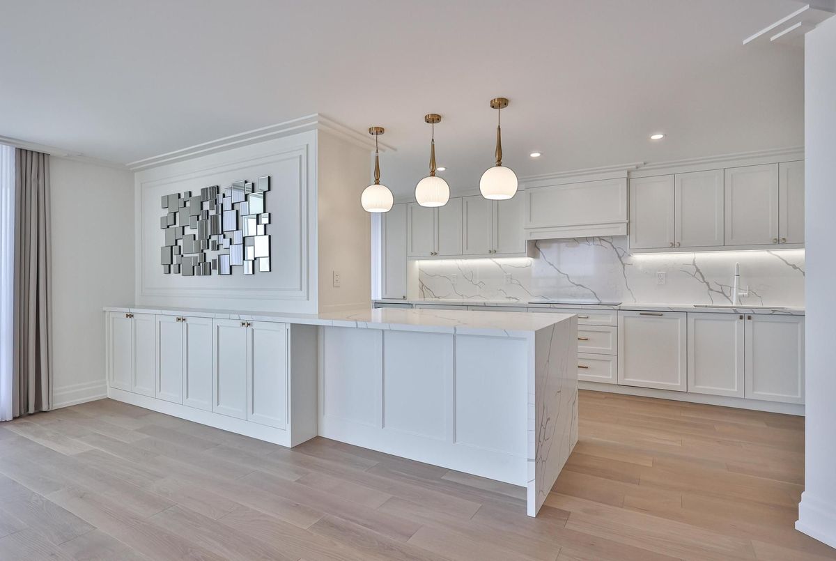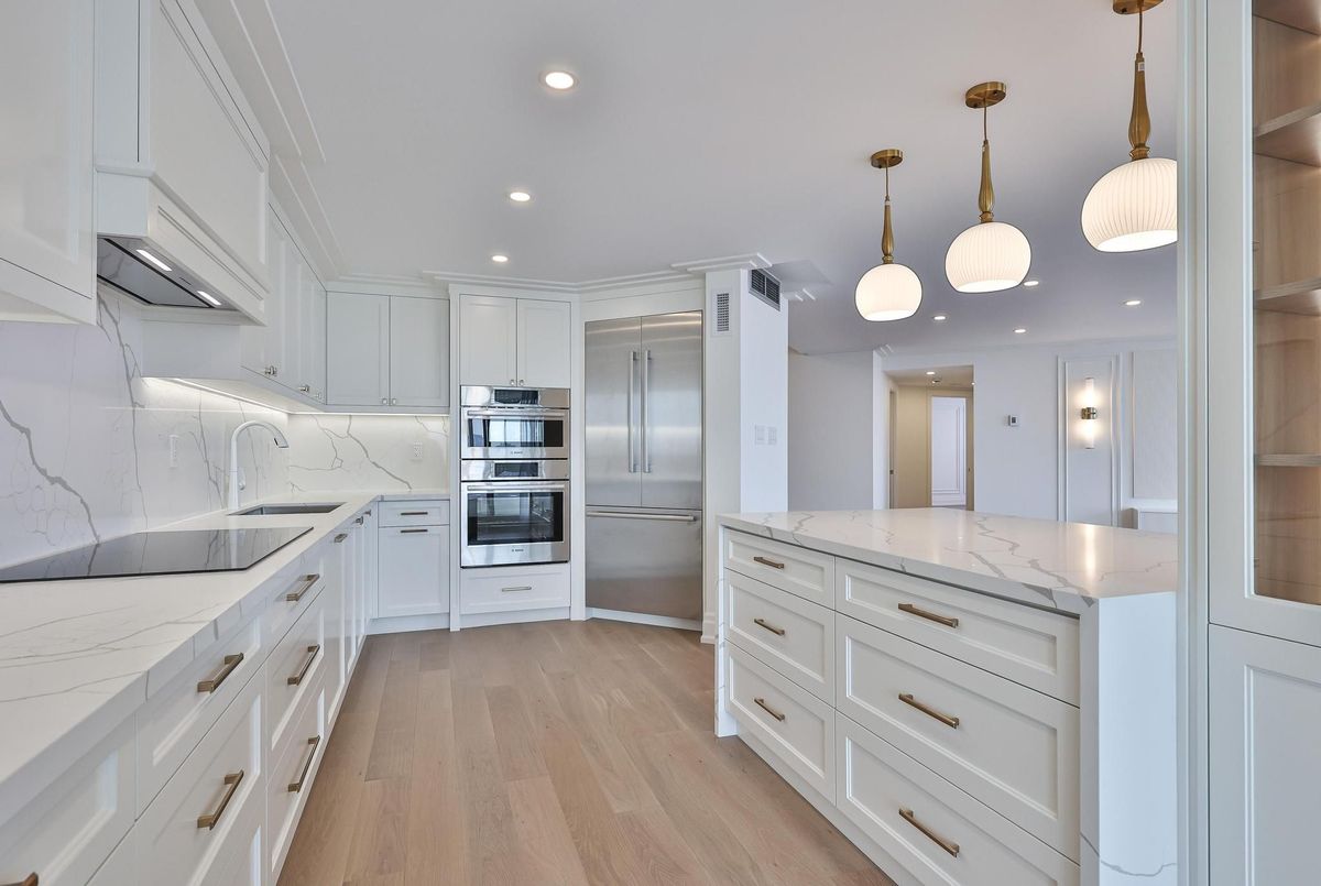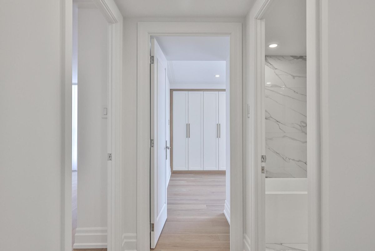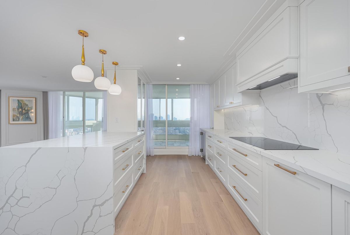 *Perched on a high floor within one of Forest Hill's most distinguished boutique residences, this exceptional suite has been completely redesigned and finished to the highest standards* Showcasing breathtaking, unobstructed southeast views of the city skyline, floor-to-ceiling windows flood the home with natural light and frame magnificent panoramic vistas , creating a bright and elevated atmosphere throughout*Offering 1,939 sqft of beautifully finished interior space, including an approximately 200 sqft solarium-style enclosed balcony, the residence impresses with its generous scale and seamless layout. The solarium serves as a versatile extension of the living area - ideal as a home office, reading retreat, or tranquil lounge overlooking the city. The open-concept design flows effortlessly, with well-proportioned bedrooms thoughtfully positioned for privacy and comfort*Every detail has been carefully curated*Premium engineered hardwood flooring, extensive pot lighting, and elegant crown mouldings enhance the sophisticated interior* A custom built-in living room wall unit creates a stunning focal point, blending style and functionality*The designer kitchen is both elegant and practical, featuring quartz countertops and backsplash, a centre island with breakfast bar, pantry, and abundant custom cabinetry*The spa-inspired ensuite offers a custom vanity with built-in drawers and shelving, heated towel bar, and a separate glass-enclosed shower with bench seating - delivering a true retreat experience* Bedrooms are equipped with custom built-in organized closet systems*A separate laundry room adds convenience with side-by-side washer and dryer, built-in storage cabinetry, and an undermount sink* Exceptional millwork and refined hardware complete this sophisticated home*This intimate boutique bldg offers 24hr security, visitor parking, indoor pool, sauna, and recreational room - delivering an exclusive lifestyle defined by privacy, comfort, and uncompromised luxury*