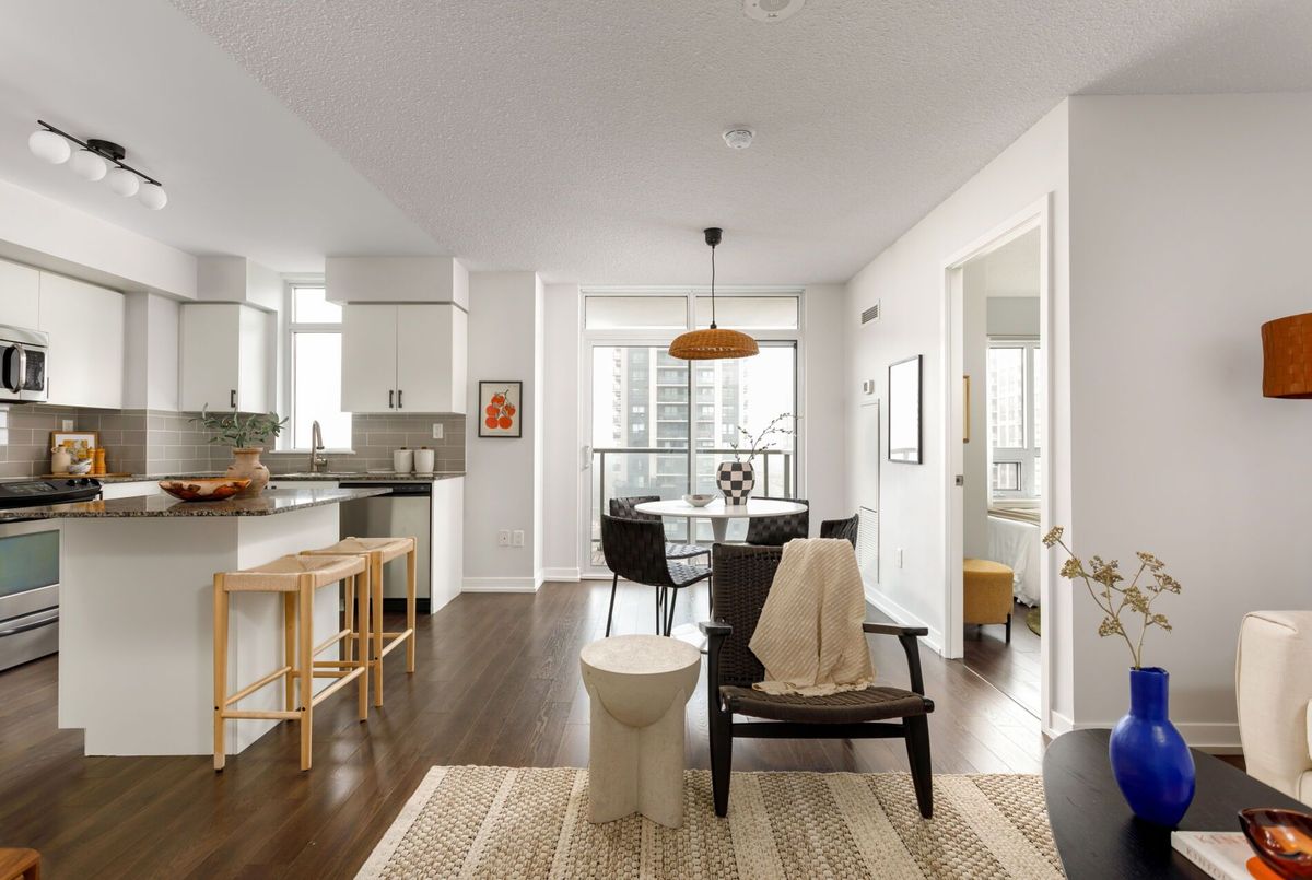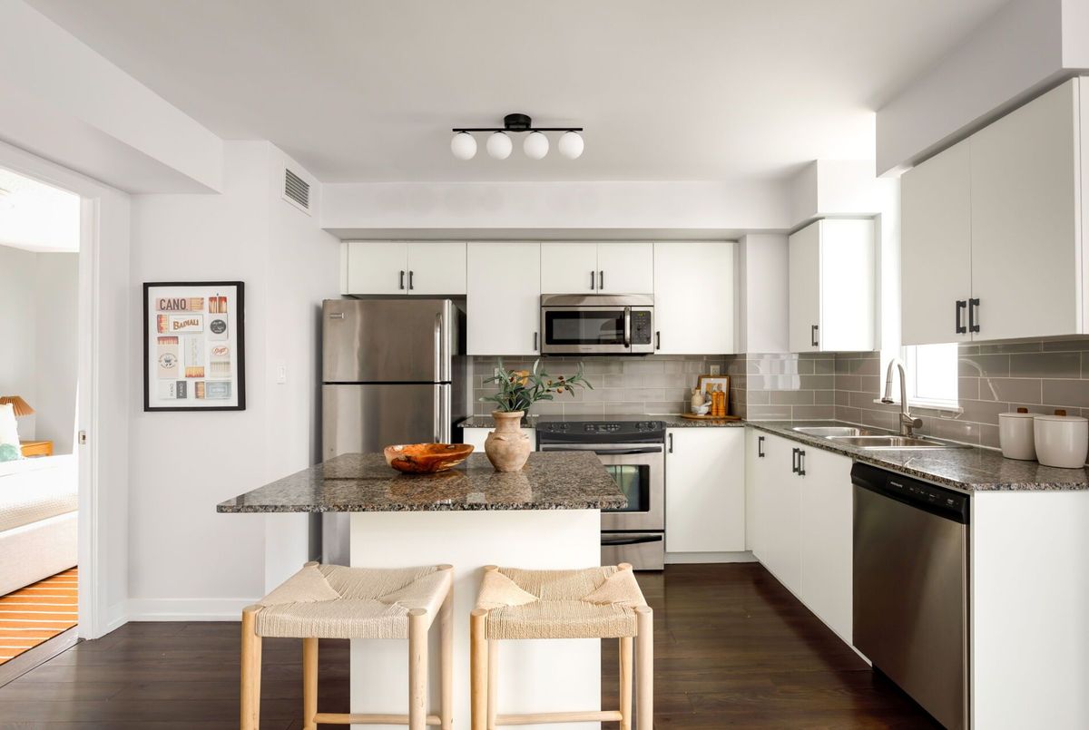 This is your opportunity to live in a bright, airy, and spacious 2-bedroom, 2-bathroom condo with parking and a locker. Perfect for first time buyers or down-sizers who want space, convenience, and functionality. This well-designed unit features a practical split-bedroom layout, providing privacy and flexibility for comfortable living and working from home. Enjoy an open-concept living and dining area filled with natural light, complemented by large windows and a modern kitchen with ample storage and island. The spacious primary bedroom includes a private ensuite and double closet, while the second bedroom is ideal for guests, family, or a dedicated home office. The northwest-facing exposure offers beautiful natural light and open city views, creating a bright and inviting atmosphere throughout the day.Conveniently located between The Junction and Dovercourt Park and in walking distance to TTC/UP Express, & West Toronto Railpath. Groceries and pharmacy across the street, and around the corner from Toronto hotspots Dotty's & Donna's. Easy walking distance to the soon to be completed 8 acre Wallace Emerson Park and community centre but without the price of newer construction.